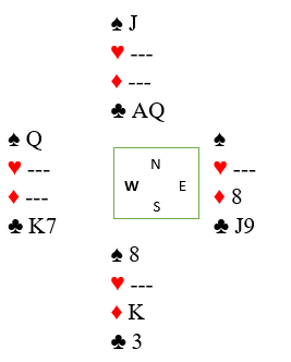 Det oppstår en såkalt show-up squeeze. Idet syd spiller ruter konge kan vest pakke sammen. Enten må han kaste spar dame (da tar spar knekt og kløver ess de to siste stikkene), eller kaste en kløver. Idet vest kaster kløver forsvinner spar knekt fra nord, og syd spiller kløver. Da kommer kongen på og A-Q tar de to siste stikkene.