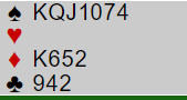 Slik det satt var det altså ingen problemer, tre runder trumf er nok og det er "claim". Men etter å ha brukt en trumf (ruter) hos vest i andre stikk kan det blir litt ekkelt hvis trumfen sitter 4-1. Den tredje kløveren kan kastes på en hjerterhonnør.