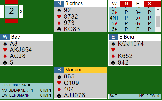 Ved det andre bordet fant Sølvknekts Thorfinsson-Mikkelsen også 6 spar etter 2 sparåpning - uavgjort spill.