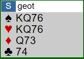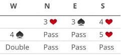 Ti stikk i 4 hjerter ga hele 93%. Det var overraskende at det ble så gått betalt, for det bør gå greit å vinne 4 hjerter for egen maskin om vest ikke spiller spar som gjorde det enkelt. Med et annet motspill må to kløver trumfes hos syd for å få de ti stikkene. Den første stjelingen med åtteren kan vest trumf over, men senere kan den fjerde kløveren trumfes med en honnør. Siden hjerter knekt deretter faller under syds ene gjenværende honnør blir det kun en trumftaper i dette spillet.