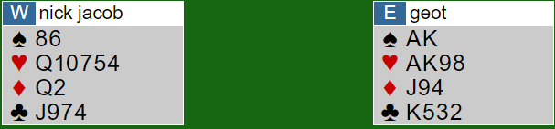 Et siste poeng i dette spillet er at Ø/V har en glimrende hjerterkontrakt. Da spillet forekom ga 4 spar med ti stikk en veldig god score til N/S. Det var ikke fordi det var så mange som gikk bet i 4 spar, men det var ganske mange bord hvor Ø/V fikk spille 4 hjerter! I den kontrakten sitter det glimrende, ruter konge i saks og kløver ess foran konge-dame. Det er kun tre tapere, en i spar, en i trumf (hjerter) og en i kløver. Det ble ved mange bord +620 til Ø/V!