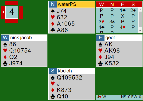 Uansett, kontrakten ble 4 spar spilt av nord ved vårt bord.