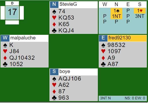 Der Brink satt vest og Drijver øst slengte Brink inn en rutermelding etter 1NT fra nord og 2 kløver fra syd. Nord endte i 3NT og Drijver spilte lydig ut ruter ess og fortsatte fargen. Spillefører lasjerte og vant med ruter konge i tredje ruterrunde. Siden han ikke visste hvordan det satt tok han naturlig nok sparfinessen som røk til den single kongen - tre bet.