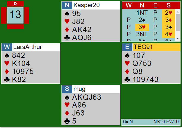 Merk den enorme dobbeltilpasningen (begge sider har tilpasning i to farger) det er i dette spillet. Det er ti enkle stikk i spar N/S, og Ø/V har elleve stikk i hjerter!