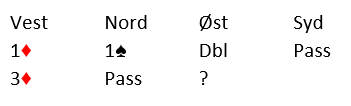 Over øst sin 3 spar doblet syd. Vest sa 3 grand, hun hadde jo for sikkerhets skyld to sparstoppere! Nord doblet imidlertid 3 grand, og det ble sluttkontrakten.