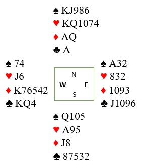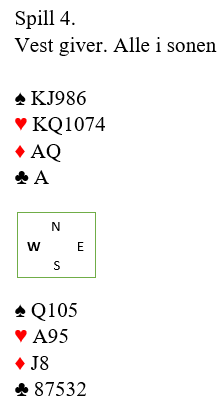 Det kom trumf i utspill fra øst. Det kan se ut som om hjerteren kan godspilles siden den sitter 4-4. Men det blir trøbbel. Selv om fargen etter hvert kan bli godspilt vil nord bli veldig «kort og rar» i trumf siden han jo må frem og tilbake mellom hendene, og godspilt hjerter kan neppe hentes til slutt.