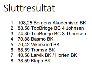 Bergen Akademiske BK (Bakke - Charlsen og Berset - Ekren) vant NM-finalen for klubblag suverent. På de neste plassene fulgte TopBridge Johnsen (Johnsen - Stokkeland, Furunes - Mikkelsen og Aaseng - Johansen) og TopBridge Thoresen (Brandsnes - Thoresen, Høyland - Ovesen og Fasting - Lie). Aaseng - Johansen ble nummer 2 på butleren.