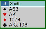 Her er det akkurat de samme honnørene, men jeg har tatt bort ruter 6 og gitt vest hjerter 6 i stedet. Så lite skal det til før det er umulig å bli kvitt en hjertertaper i tillegg til at N/S har ett stikk i ruter. Men det er jo mange andre fordelinger som gjør at 6 spar er bra, så de som var (litt) optimistiske hadde nok grunn til å være det.