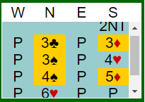 Bjørn Brovold åpnet med 1 hjerter, pass fra undertegnede og Hans Petter Brynildsen (V) men så slo Arne Marthinussen til med budet 4 spar. Etter to ganger pass kom så Vest på banen igjen ved å melde 5 ruter og så fulgte pass fra Arne og Bjørn. Hva ville du nå gjort som Syd?