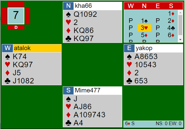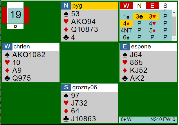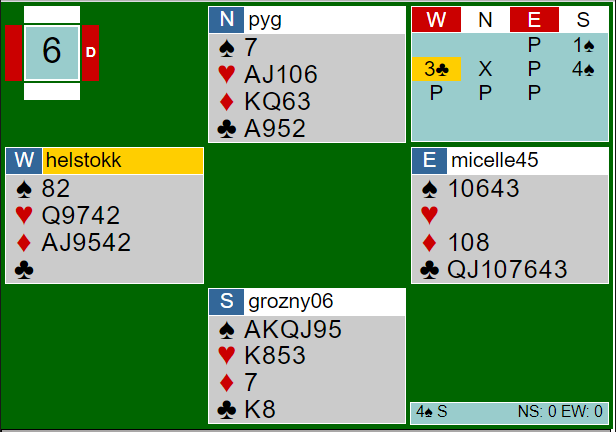 Ved det andre bordet meldte Meckstroth-Rodwell 6 grand etter en sterk 1 kløveråpning fra syd og naturlig, svakt innhopp 2 ruter fra vest. Da spillefører tippet hjerteren noterte han tretten stikk siden vest lå unna med esset i første ruterrunde, LEVINE +1020. Spillet ga hele 15 IMP inn for LEVINE.