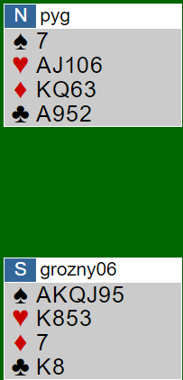 Det er jo en rutertaper, så det må tippes korrekt på hvor hjerter dame er plassert. Det ser litt ut som om det ikke spiller særlig stor rolle om det er spar- eller hjerterkontrakt, eller kanskje er grandkontrakt bedre?