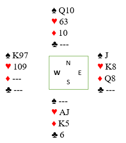 Vest spilte ut sin single ruter til liten, knekten og esset. Fortsettelsen ble kløver ess og kløver til damen fulgt av hjerterfinesse som holdt. Så ble vests trumf tatt ut i to runder til. Etter det kom nøkkeltrekket, ruter 10 fra hånden! Husk øst hadde kun igjen damen, og da han stakk med den var resten plankekjøring. Ruter 9 var inntak til nord, og en hjerterfinesse til kunne tas. Jeg må innrømme at under meldingene tenkte jeg ikke på at ruter 9 skulle bli et nøkkelkort!