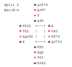 Det ble på en måte feil av øst å la N/S spille 3NT, men han gjorde nok det fordi han hadde et håp om bet i den kontrakten med inntak til den lett godspillbare hjerterfargen. Med hjerter ut er det imidlertid ti sikre stikk, og det blir elleve om spillefører får fire ruterstikk. Selv om vest skulle finne på å spille ut spar dame mot 3NT er det ti stikk hvis spillefører dukker fra nord to ganger slik at Ø/V sin spar blir blokkert. Den starten (spar dame i utspill) gir imidlertid et kjedelig valg, og det kan bli lang nese hvis det dukkes fra nord to ganger, for etter spar dame vinner første stikk og spar knekt andre stikk kan det jo hende vest spiller esset i tredje stikk! Han kunne jo hatt AQJ femte eller sjette fra start.