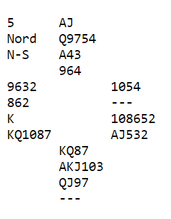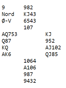 De fem andre lagene var i slem. Romerike sitt Ø/V par noterte +1470 "fete", men det var 9 IMP ut da 6 NT doblet føk hjem (Strømsvåg-R.Paulsen) ved det andre bordet. Om syd treffer utspillet blir det +800 på N/S i stedet for -1880, en sving på hele 2680 poeng. Det ville gitt 20 IMP inn i stedet, 29 IMP i sving i kampen som de tapte med 14 IMP.