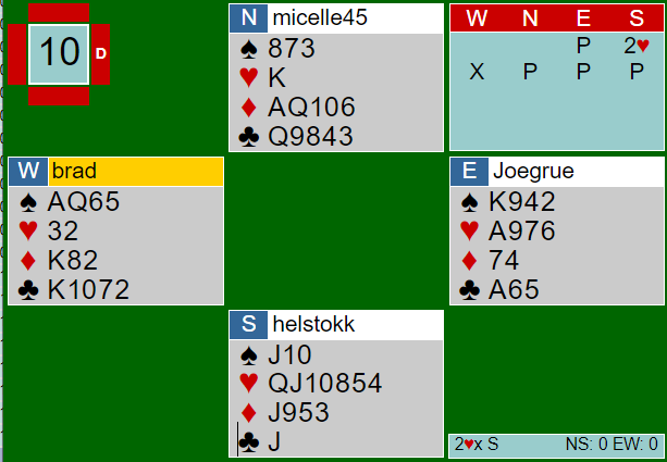 Spillefører har fem hjerterstikk og ett stikk i spar. Dessuten kan det fort bli ett stikk i ruter, og i så fall koster 3 hjerter doblet kun 300 mot en sikker utgang til Ø/V. Motspillerne mot hjerterkontrakt kan imidlertid få fatt i +500 med et veldig godt motspill. Da må de få tatt tre runder kløver slik at vest får kvittet seg med en ruter, så tre ganger ruter som vest kan trumfe med sin single trumf!