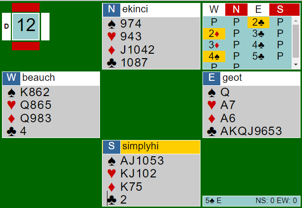 Etter en halvmeter med kløver så jeg at det kunne bli et innspill i trekortsposisjonen om samme motspiller har spar ess og ruter konge. Men jeg turde ikke spille på det da det innbærer at ruter ess ikke må innkasseres mot slutten, og da kan det hende en ikke får for det kortet om feil motspiller kommer inn. Så i 5 kløver ble bare de elleve stikkene tatt.