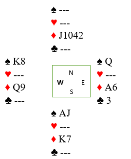 Spillefører må lese sitsen da syd kan kaste "lurt", men normalt setter motspillere seg på det de kan holde så lenge som mulig (her 2-2 i de to fargene). På kløver 3 fra øst må syd blanke spar ess, eller gå ned på singel konge i ruter som i så fall kan toppes ut. Holder han singel spar ess og ruter konge dobbel kastes en spar fra vest, så spar til syd som må avslutte fra K-7 i ruter, tolv stikk.