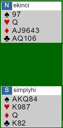Det gjorde den ikke da øst hadde sikkert trumfstikk, og dessuten satt alt det andre helskjevt med singel ruter hos vest, og dobbel hjerter hos øst. Kontrakten kollapset fullstendig, fire bet. Det ga nok et tosifret tapsspill for det tyrkiske laget, 12 IMP.