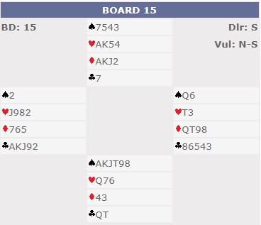 I et spill ganske tidlig ble vi holdt ute av meldingene fordi de åpnet med en svak 1 NT. Det er ikke alltid gull, men skulle vise seg å være helt greit denne gangen. Spillet så slik det ut: