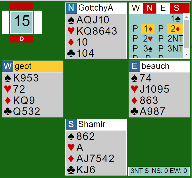 Ved bordet la spillefører kløver knekt i andre stikk. Den ble stukket med damen, og nå kunne ikke kontrakten vinnes lenger hvis det korrekte motspillet ble funnet! Slik så hele spillet ut fra start: