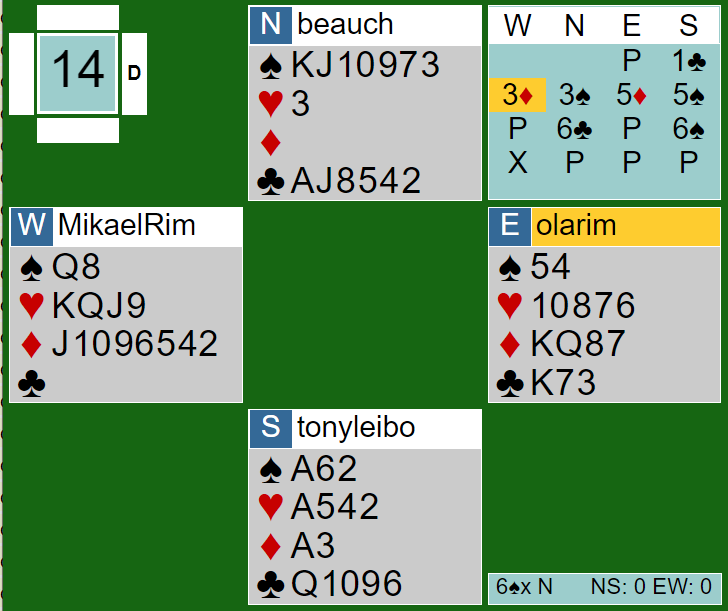 På et tidspunkt måtte det velges om de nødvendige stikkene skulle fås i ruter eller hjerter. På grunn av overskriften og innledningen har du sikkert gjettet hva jeg gjorde. Jeg stolte på Øyvinds fordelingsutspill (og har aldri tilgitt han