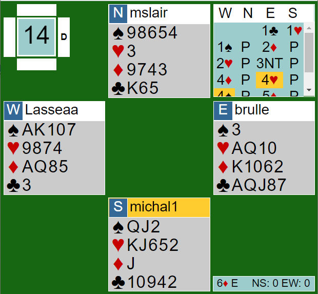 Ø vet nå at makker er kort i hjerter, men melderom er jo tatt bort og det blir gjetting om tilpasning.. Men full av optimisme meldte Norstad 4 spar. Så fulgte to ganger pass. Med få motspillstikk, men har bare makker her litt tilpasning i kløver vil stamp på 5- trinnet være lønnsomt tenkte jeg. Dermed 5 hjerter. Dobling fra Øst advarer jo og etter litt vurdering før pass fra Vest avsluttet. Hjerter ut og da så jeg jo at her var gedigen feilbedømming på gang! Litt hjalp det da Vest var renons i hjerter, men likevel var det lett å se at 4 spar neppe kunne vinnes. Og det stemte da det etterpå viste at frivillig bud i ny farge på 4- trinnet var med en nokså ordinær 4- korts farge men OK styrke og sekundærstøtte i ruter. Jeg trodde Norstad hadde minst 6+ i fargen og gikk på limpinnen! 3 bet var umulig å unngå, men det ga jo 2—38 i score. Pinlig!
