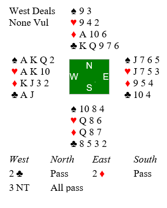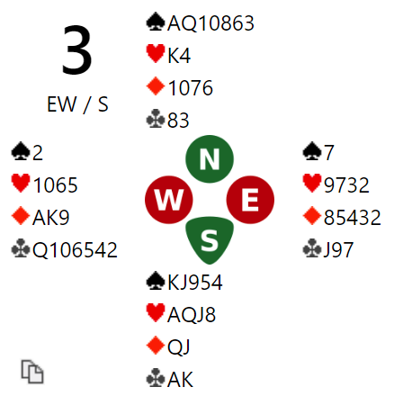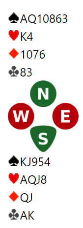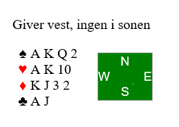 Kløver 8 kom ut til esset og min knekt, men Øst fortsatte med sak av hjerter her og damen vant. Trolig har Øst 4- kort spar sluttet jeg meg til og dro derfor sp J som dro D, min K og 6-er fra Vest. Hjerter opp vant Vest med kongen og servet ruter til kongen. Sp 8, 10- er og mitt ess med sak av liten kløver fra Vest var som ventet. Du aner vel fortsettelsen nå?