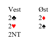Øst åpnet med 1 kløver (2+) og jeg hadde lyst til å hoppe innpå med 2 hjerter, men 4- kort major sidefarge er da «ulovlig» så jeg valgte å melde 1 hjerter (selv om svak langfarge ikke er gunstig) og Vest hoppet til 3 kløver, alertert som svak med langfarge. Gerd (N) meldte så 3 NT, pass fra Øst og siden makker må ha en del i spar og helt sikkert kort i hjerter valgte jeg «el Desperado»- budet 4 spar. To pass mens Øst doblet!