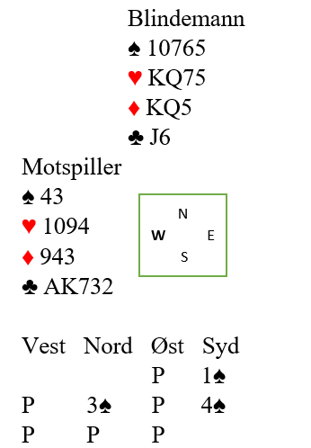 Arild spilte slik etter 1. stikk og kl K i 2. Han stjal en ruter, tok sp A og sp K (sak av kl + ru selv) og kl A før en spar ble stjålet. Så ny ruter til røff der Øst måtte på med kongen. Dett var dett, trumf fra bordet stakk Øst med esset, men spar opp kunne stjeles med hj 10 og trumf K og J trakk ut resten av trumfen som var ute og hånden sto så. 11 stikk og 31- 13 i score etter bra håndverk av Simensen!