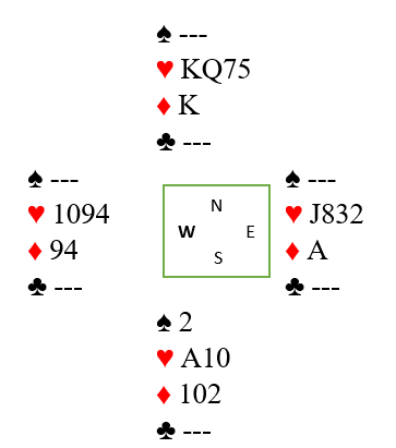 Men fra stakt av kunne spillet gått slik. I 2. stikk trumf til bordet, stjele en ruter, spille nok en trumf til bordet og spille kløver til dukk. Syd vinner og spiller nok en ruter til røff og Øst stjeler en kløver Men nå er en Reverse Dummy gjennomført og når resten av trumfene i bordet tas oppstår en spesiell situasjon.