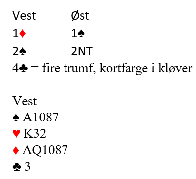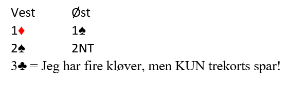 1NT blir en ufyselig melding med dette, men her har åpneren en "korrekt" 2 kløvermelding andre gangen da det jo er naturlig og viser normalt minst fem ruter og minst fire kløver. Å melde 2 kløver er ikke feil, og det kan godt føre frem. Likevel er dette en hånd hvor å høyne til 2 spar trolig vil fungere bedre i det lange løp. Hver gang makker passer på 2 spar er vi i en grei delkontrakt. Slike hender spiller ofte bra (stjeleverdi hos åpneren) på 4-3, og svarhånden kan jo godt ha en svak hånd med femkorts farge også.