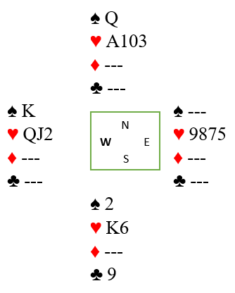 På de fire ruterrundene må det kastes ett kort fra syd, og han kan kaste en spar, eller en hjerter. La oss si han kaster en hjerter. Fra nord må det kastes to ganger. Det som ikke må røres er hjerteren! Det er jo en trussel mot en motspiller som kanskje må passe på både spar og hjerter, ikke usannsynlig siden vest åpnet, og har han både spar konge og dame-knekt i hjerter er han snart ille ute. Og fra nord kan selvsagt både spar og kløver kastes, det behøves ikke lengde i de fargene. Syd har jo fem kløver, og ett ekstra sparstikk for for eksempel damen vil være nok til å vinne ni stikk. Så la oss si det ble kastet en spar og en kløver fra nord.
