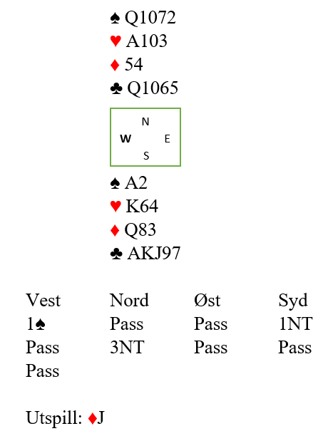 Vest spiller altså ut ruter knekt mot 3NT. Mange tenker at det er nok fra noe sånt som J109-fjerde, eller femte, og legger liten som styrkekast. Og det er greit hver gang syd har A-Q, men det blir fryktelig feil om syd har bare damen som det var i dette spillet. Da får han ett stikk i den fargen som han ikke burde fått, og det er det niende stikket på et sølvfat helt uten kamp!