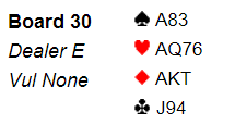 I den nevnte IMP-turneringen i forrige uke noterte fem av 11 Ø/V-par +620 i 4 hjerter. To par var i 3NT og gikk raskt med idet N/S tok fem kløverstikk, og fire spillefører la ned ruter ess og fikk tre rutertapere og en kløvertaper..