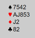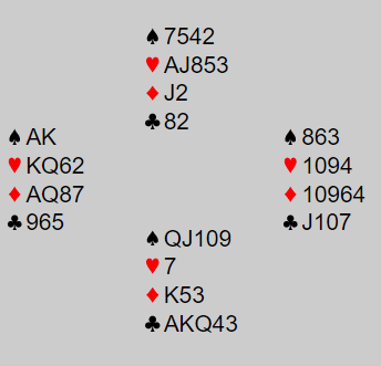 Ved det andre bordet hadde ikke den islandske nord denne konvensjonen til rådighet, og nord foreslo 2 hjerter etter innmeldingen 1NT. Det ble kontrakten, og den kunne nok ha blitt vunnet. Den islandske nord gikk imidlertid en bet, 12 IMP til Norge.
