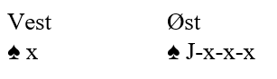 La oss si det ikke sitter kløver Q-J-x tredje, men at vest følger kun to ganger. Da vet du at øst har fem kløver som sammen med tre hjerter og minst tre ruter = minst 11 kort!. Det betyr at øst ikke kan ha fire spar lenger. Hvis det i såfall sitter 4-1 må det være vest som har fire spar. Du spiller spar konge. Om øst følger med nieren kan du trygt spille damen i fargens andre runde uten å stå i fare for å bli lurt av øst med J-9-x-x.