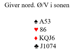 Du spiller kongen. Idet øst følger med nieren fortsetter du med damen for å oppdage denne sitsen idet øst ikke følger farge, og gjør han ikke det kan du ta den markerte finessen med nords A-8.