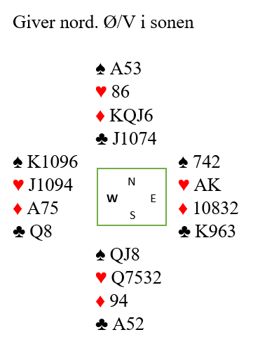 Du spiller kongen og fortsetter med liten til esset. Sitsen oppdages idet vest ikke følger farge andre gang, og du tar den markerte finessen over østs knekt.
