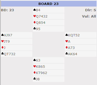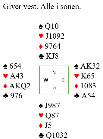 En glimrende storeslem. Veldig få fant frem til 7 spar, og de som gjorde det tok nok bare en sjanse med vests kort, en ikke så hårreisende gambling da øst må ha noen honnører i kløver/hjerter for å ha for sin splinter-melding. Men det var flere i utgang (!) enn i slem, så de som var i 6 spar med tretten stikk fikk 62%, bra betalt.