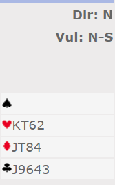 Jeg syntes hjerter ut unna kongen opp mot den sterke hånden, og med bra kort hos syd også virket for aggressivt .Kløver ut fra knekten er også uappetittlig, og kan gi spillefører ekstra stikk, men det virket for meg tryggere. Så det ble kløverutspill. Håpet var at det ville bli en bet etterhvert siden ruteren vil gi ett stikk mindre enn de forventer, og kanskje får jeg også for hjerter konge. Men nei...