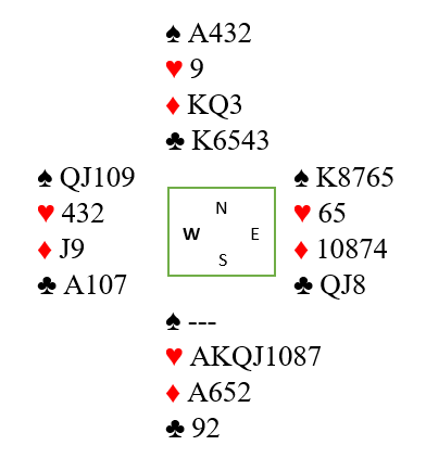 Sparutspillet bør trumfes på hånden. Vent med spar ess til du vet hva du bør kaste! Så tas trumfen ut i de nødvendige antall rundene før du tester ruteren med ruter ess fulgt av K-Q slik at du er inne hos nord idet du finner ut rutersitsen. Sitter fargen 3-3 står håndens fjerde ruter, og du kaster en kløver på spar ess: