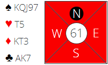 Dette er vanskelig. Du har så gode verdier at det godt kan stå slem, men to små hjerter gjør det litt skummelt. Det kan jo være to hjertertapere fra start. Hvis syd høyner makkerens sperremelding til 4 hjerter er det større sjanse for at makker har singel hjerter, og da er det kanskje en bedre sats å melde slem (6 spar)?