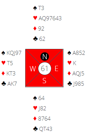 Det som må ha skjedd (?) er at etter kløver 6 ut som tok med seg syds tier ble det etter å ha tatt ut trumfen spilt kløver knekt fra øst. Om syd ikke dekker blir det fortsatt kun tolv stikk, men hvis knekten blir dekket med damen blir det fire kløverstikk. Kongen vinner etter knekt- dame, og syveren/femmeren er plutselig blitt stikk! Dermed er det fire kløverstikk, og den fargen gir ett avkast for hjerter, og på den fjerde ruteren forsvinner vests andre hjerter – tretten stikk.