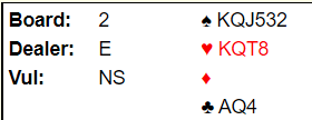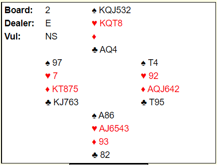 Ved vårt bord åpner jeg også med 1 ruter, hadde makker kunnet melde 1 spar ville 3 NT deretter vært aktuell gjenmelding, men opps meldte spar begge to og over 3 spar hoppet jeg til 5 ruter som merkelig nok fikk tilslaget. Kontrakten kunne ikke vinnes, men 2 bet var selvsagt bra vår vei. 450- 100, altså +320 på spillet ga laget vårt +8 imp.