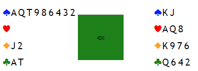 Jeg spilte ru 10 ut men da bordet hadde esset som vant sank håpet om bet litt. Sp D fikk løpe til min konge og nå var det bare en måte å fortsette på. Kløver til makker og ruter til stjeling, men det ble med drømmen, Haltbakken hadde ikke kløver og kunne stjele returen min til Tons kongge. Etterpå var det å dra ut min siste trumf og resten sto. 750 til dem, men likevel vant vi med 21-17. Like mange hadde klart å melde 6 spar etter omtrent samme budserie men hopp til 6 spar fra Vest, ikke helt urimelig sats.