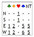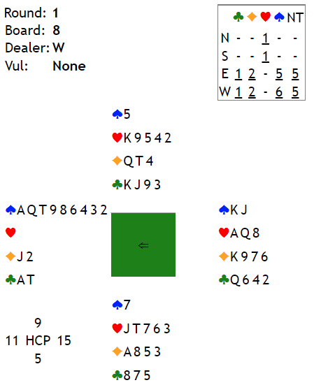 Ved vårt bord åpnet jeg med 1 kløver, Arne svarte 1 spar og så viste jeg 18-19 HP ved hopp til 2 NT. Arne har god støtte, 13 hp og 5- kort spar, og mer enn utgang kan stå med 31-32 poeng. Likevel valgte han bare å melde 3 NT og da var det naturlig for meg å stoppe der. Reuter ut var det verste å få, men jeg så jo at sitter de sorte fargene greitt er det 12 stikk rett ned. Valgte likevel å smyge første stikk og damen i Øst vant. Ny ruter dro J, K og ess og så gikk jeg løs på kløverfargen som var best. Men etter kl J og mer var Øst utsolgt, hallo- 5-1 imot og Vest har da steng for 5. runde. Da prøver vi sparfargen, Liten til kongen og ny opp til esset og Vest som først la 9-eren var utsolgt i 2. runde. Altså var mine «12 sikre» vinnere redusert til 10, men man spiller jo videre. Etter sp A tok jeg for resten av honørene i kløver og da Øst følge at hjertersitsen ikke burde røpes gikk en ruter. Da spar til damen og Vest sakte ruter var jeg litt på hugget igjen -og valgte å sette inn Øst på sp J som sto. Og da Øst ikke hadde flere rutere igjen var resten mitt, sp 5 og de to stå-stikkene i hjerter tok resten. Nesten gledelig å se at hj D satt gardert i Vest så at vi var beskjedne ville nok lønne seg siden slem ikke kan stå. Men den gang ei! Bare to bord ellers var i utgang, de fire siste spilte slem og to av dem vant.