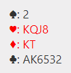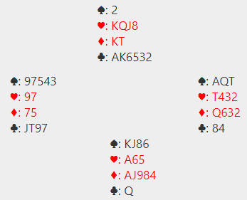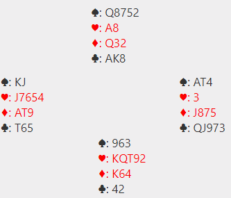 Du har jo 11 omtrent 100% sikre stikk, men hva har makker til hjlp? Faren er at trumfen ikke sitter uten at det blir taper der og har makker en konge er det alltid lilleslem. Men hvordan få meldt? Terje Solli og jeg bruker tvetydig avslag på kravåpningen 2 kløver med ikke «seckond neg» på åpners fargegjenmelding, og da bestemte jeg meg for å vise ekstrem styrke i poeng og spillestyrke ved hopp til 5 hjerter, men Solli passet likevel ned. Og normalt vil det være høyt nok?