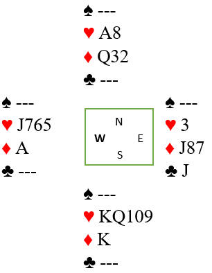 Vest spilte ut hj 2 (norske), jeg ville jo spille trumfen fra bordet og prøvde derfor hj D som vant stikket. Trumf til 3, K og 2 fulgte. Ruter til esset og så ny trumf der Øst stakk med esset og Vest la 8-eren. Håp om å unngå mer enn 5 tapere var der. Kl A fra V med styrke fra Øst, så kl D der jeg la knekten og deretter ruter til damen i Vest og min konge. Vinner jeg nå? Ruter til 6-er fra Øst og sp 9 fra meg men Vest kunne stikke over med sp 10. Deretter ble kl K tatt og så kom hjerter 3 som jeg slapp men Vestkunne stjele med sp J. Og da var det -1 og 11-31 til oss.