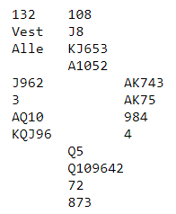 Og for vinnerlaget «tryllet» Bakke hjem 4 hjerter, dog med litt annen informasjon. Underveis hadde Ø/V meldt og støttet ruter, og over 3 hjerter foreslo vest 3NT.