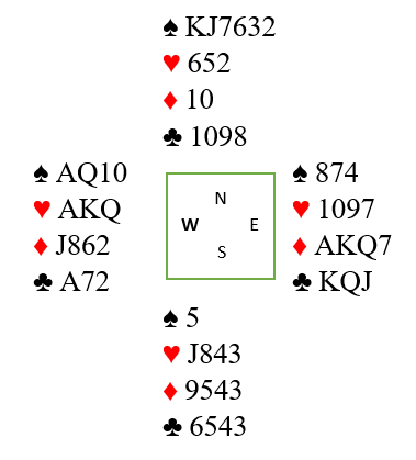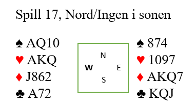 Øst stjal ruterspillet og tok for hjerter konge, så hjerter til stjeling, ruter til stjeling og den siste hjerteren ble trumfet. Jeg kunne trumfe over, men det var uansett originalstikk, og spillefører tapte kun ett stikk i fargene spar, ruter og kløver, Ø/V +620.
